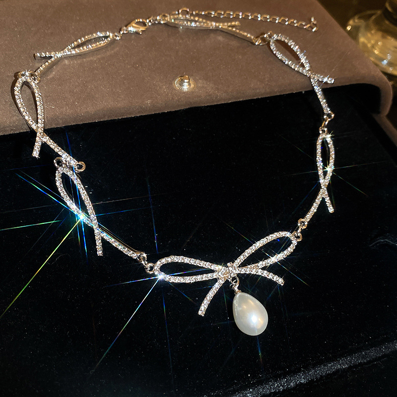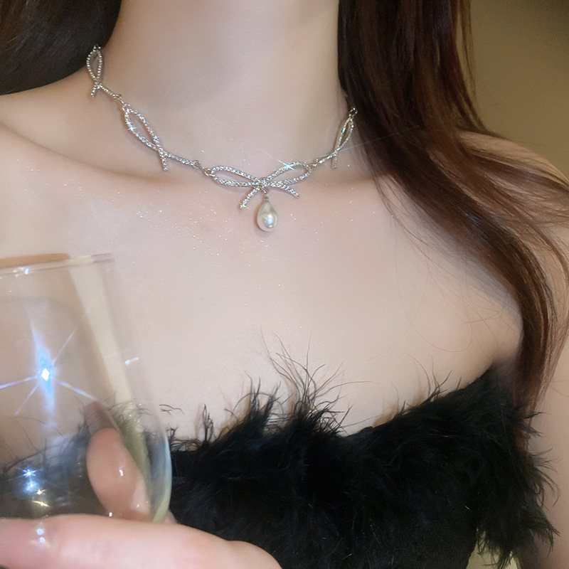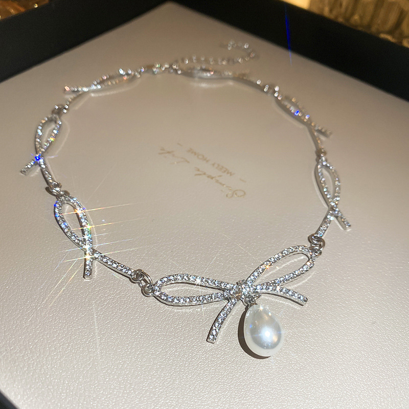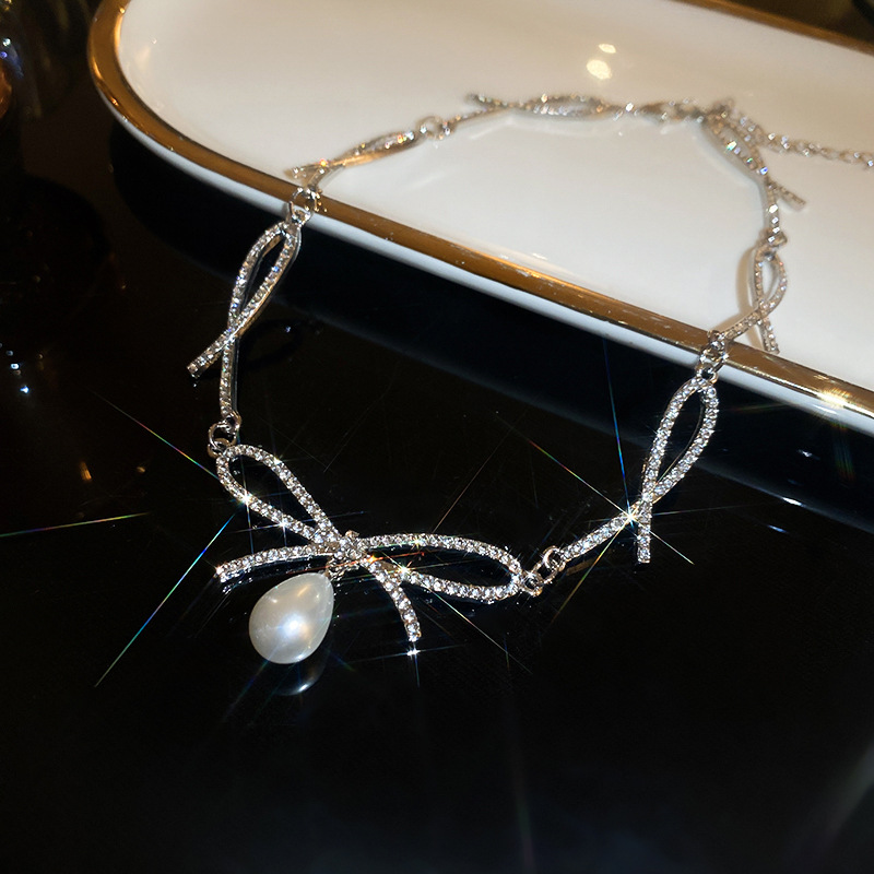 Rhinestone Zinc Alloy Necklace, with Plastic Pearl, with 8cm extender chain, for woman & with rhinestone & hollow, silver color, Length:34.5 cm, Sold By PC