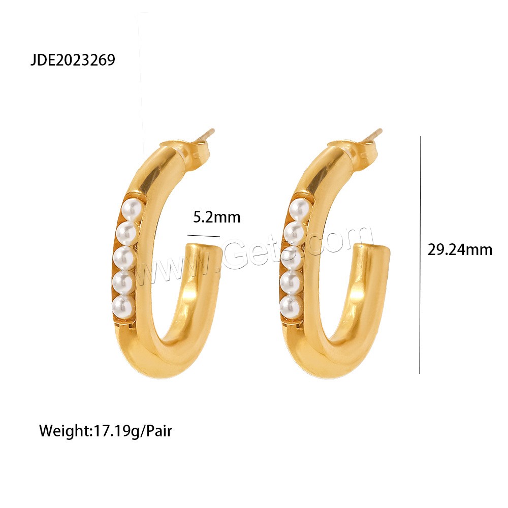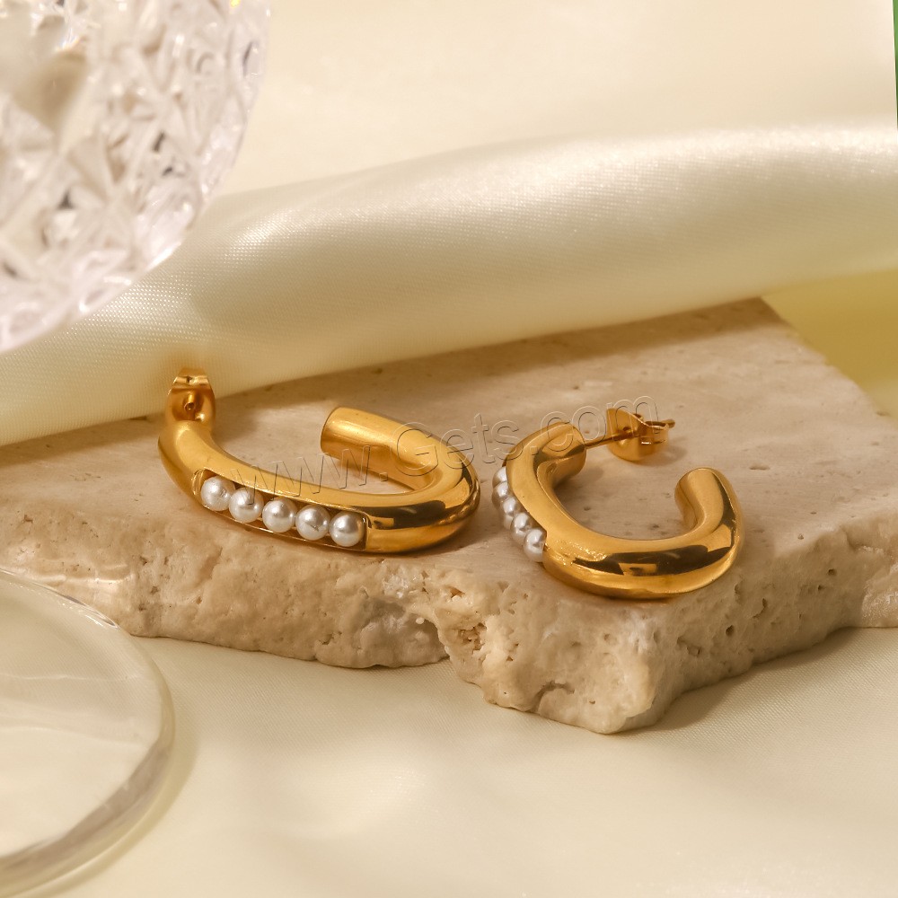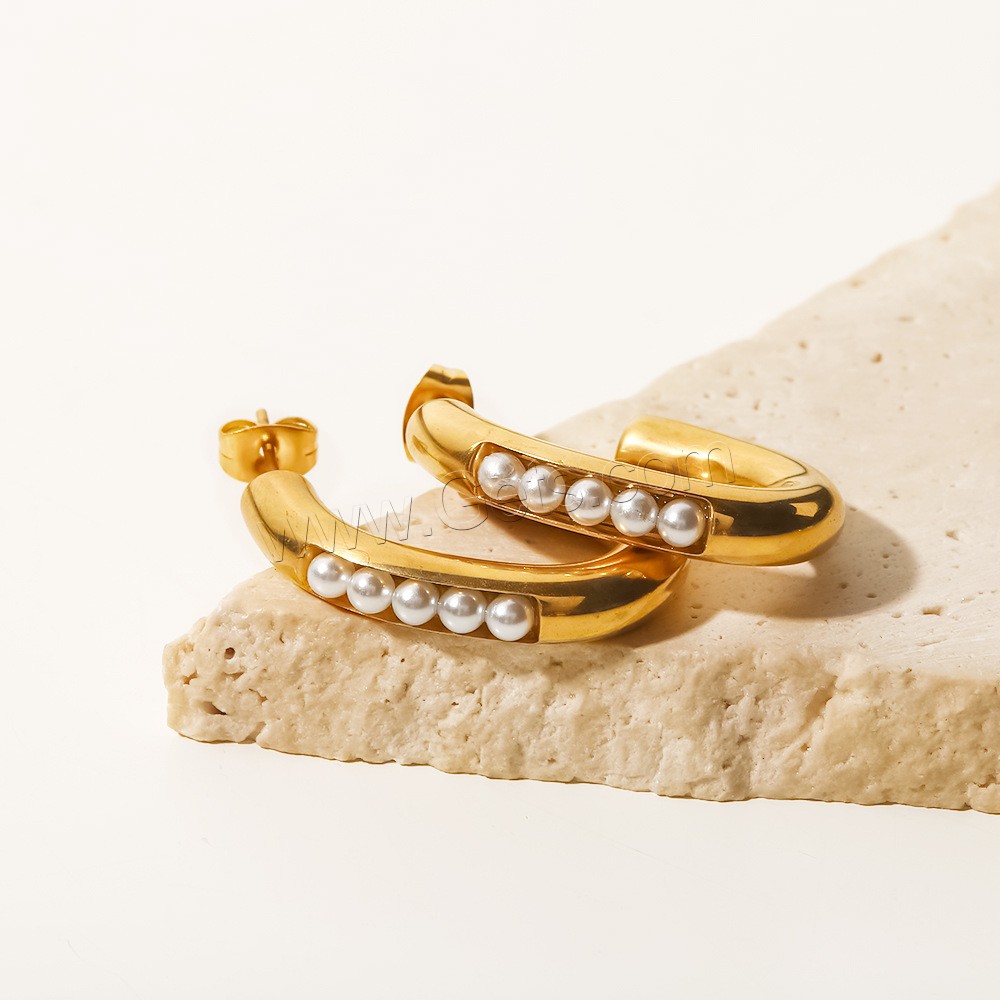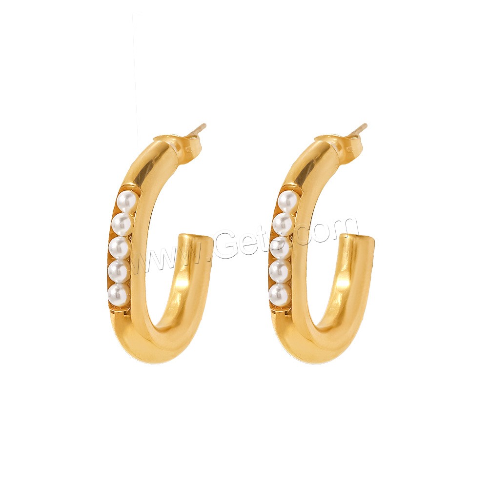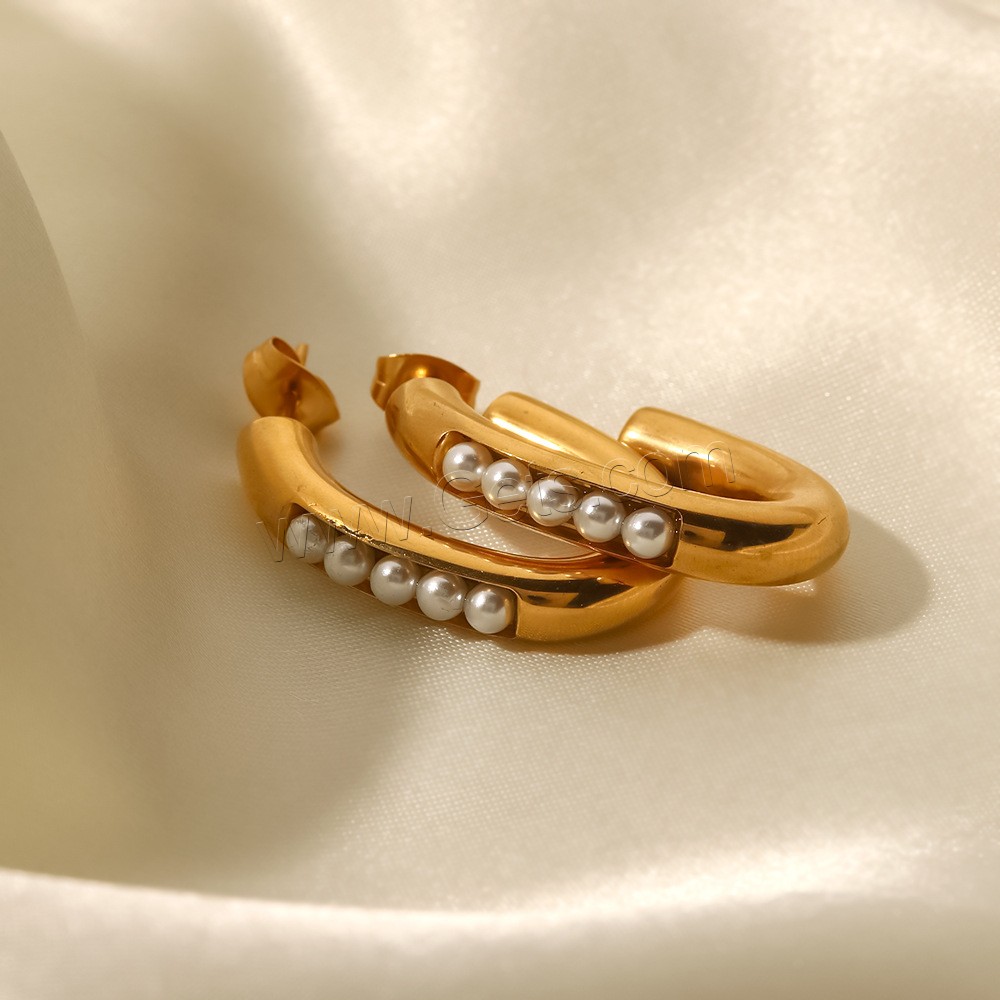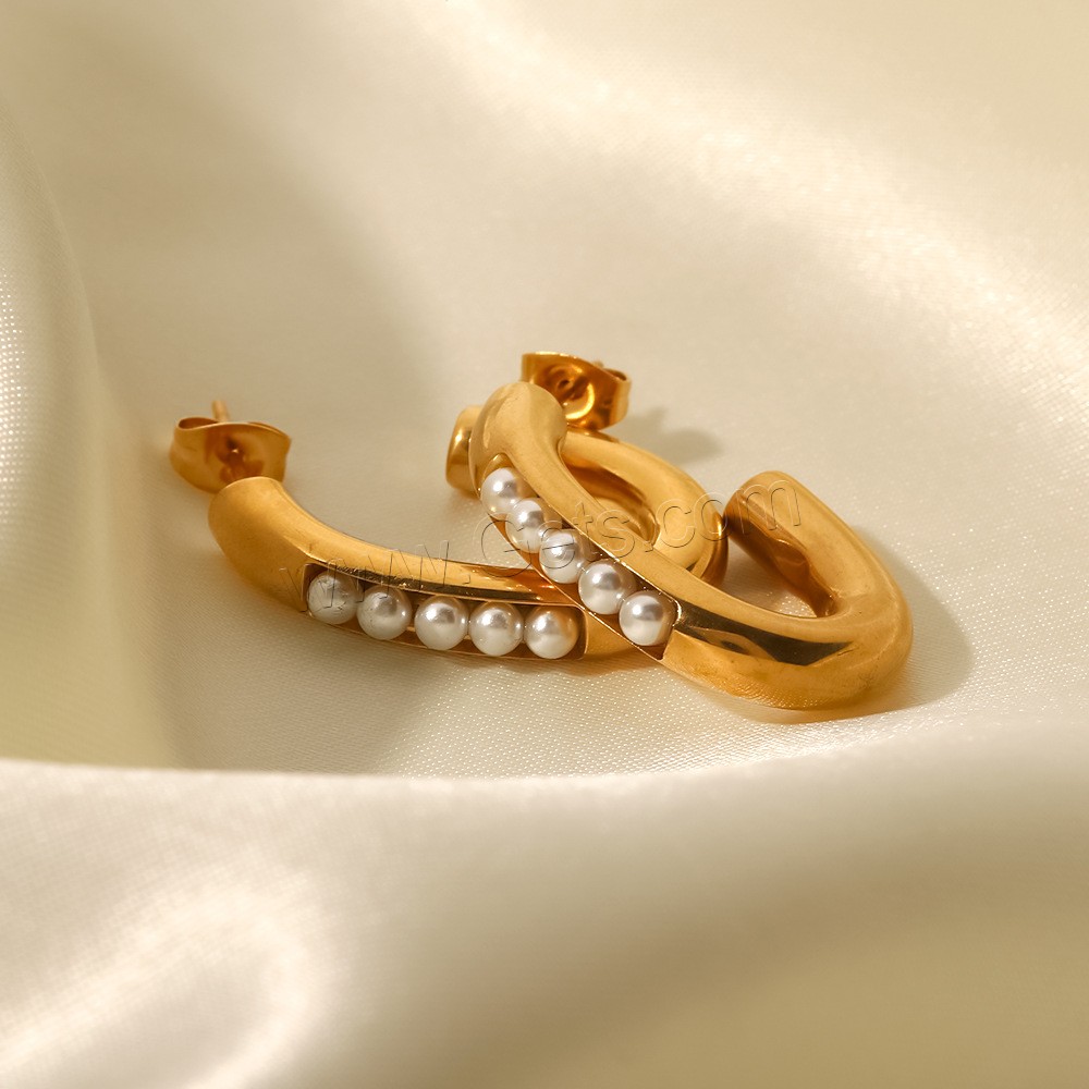 Stainless Steel Pearl Stud Earring, 304 Stainless Steel, with ABS Plastic Pearl, Vacuum Ion Plating, fashion jewelry & for woman, golden, 29.24x5.2mm, Sold By Pair