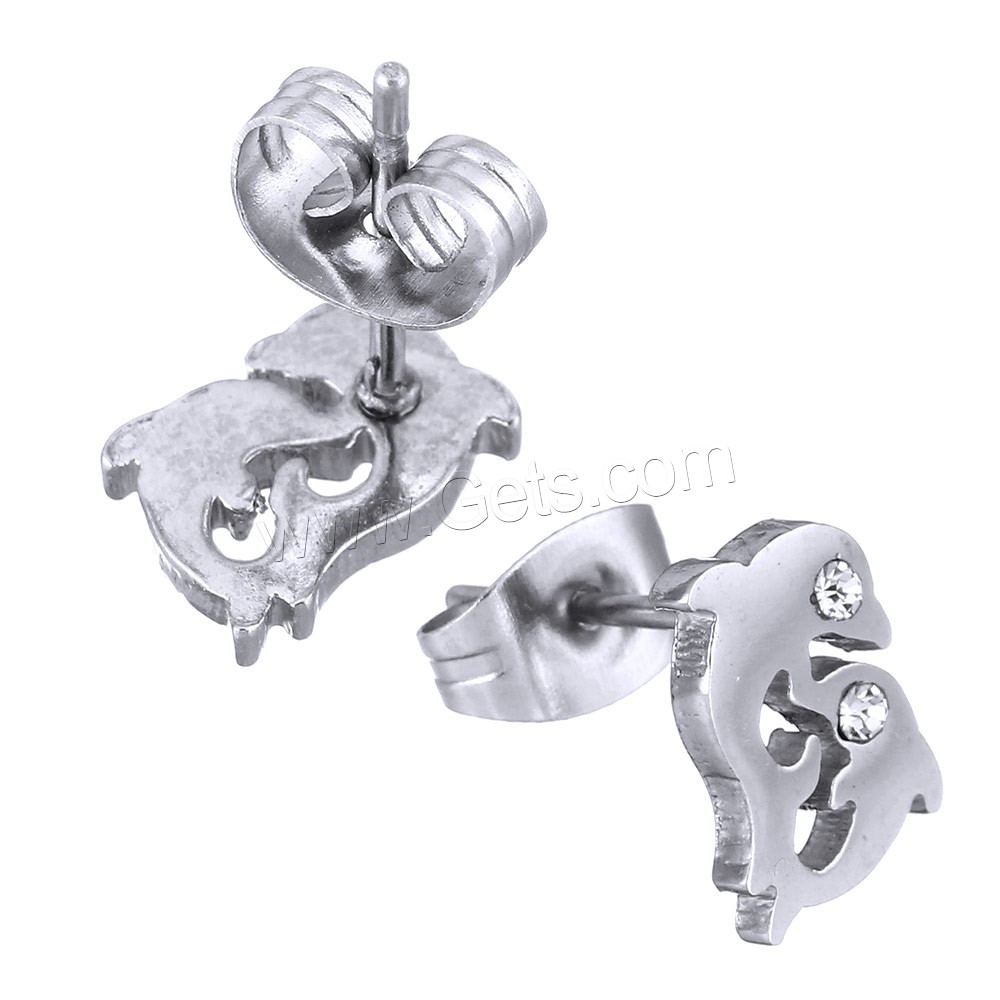 Stainless Steel Rhinestone Stud Earring, Dolphin, with rhinestone, original color, 9.5x10x12.5mm, 10Pairs/Box, Sold By Box