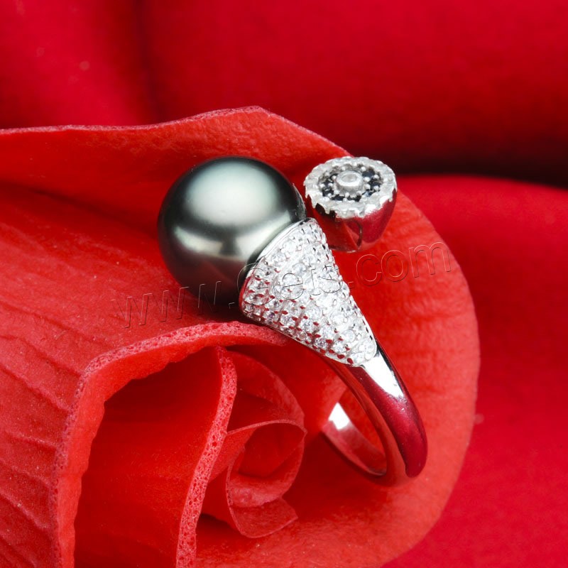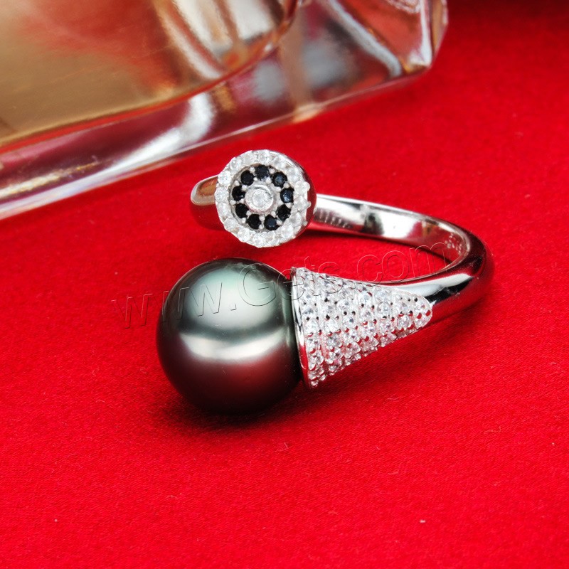 Tahitian Pearls Cuff Finger Ring, with Brass, Round, silver color plated, natural & micro pave cubic zirconia, black, 10-11mm, US Ring Size:7-9, Sold By PC