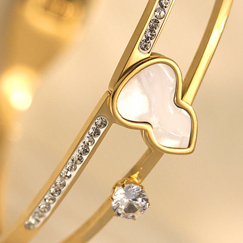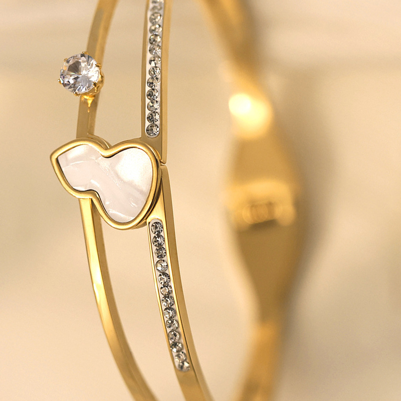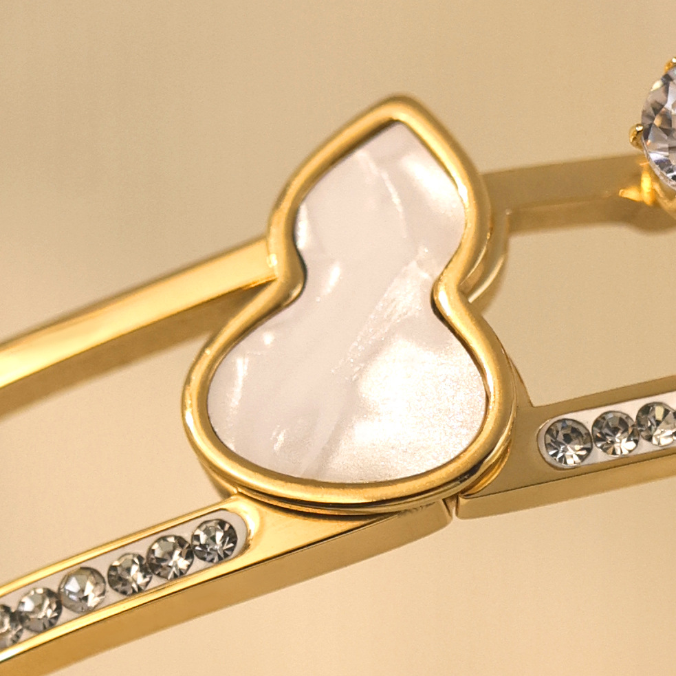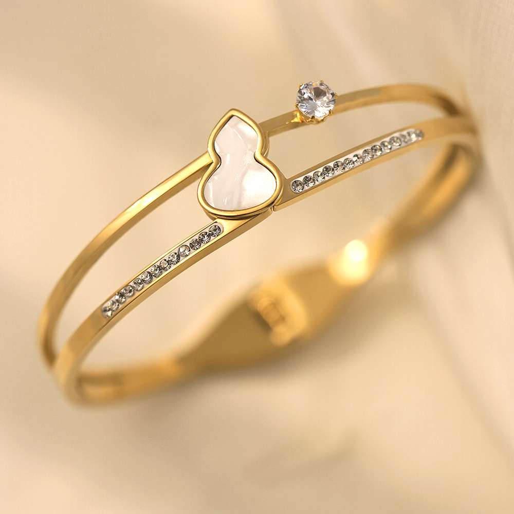 Titanium Steel Bangle, with White Shell, Calabash, gold color plated, for woman & with rhinestone, Inner Diameter:Approx 60mm, Sold By PC
