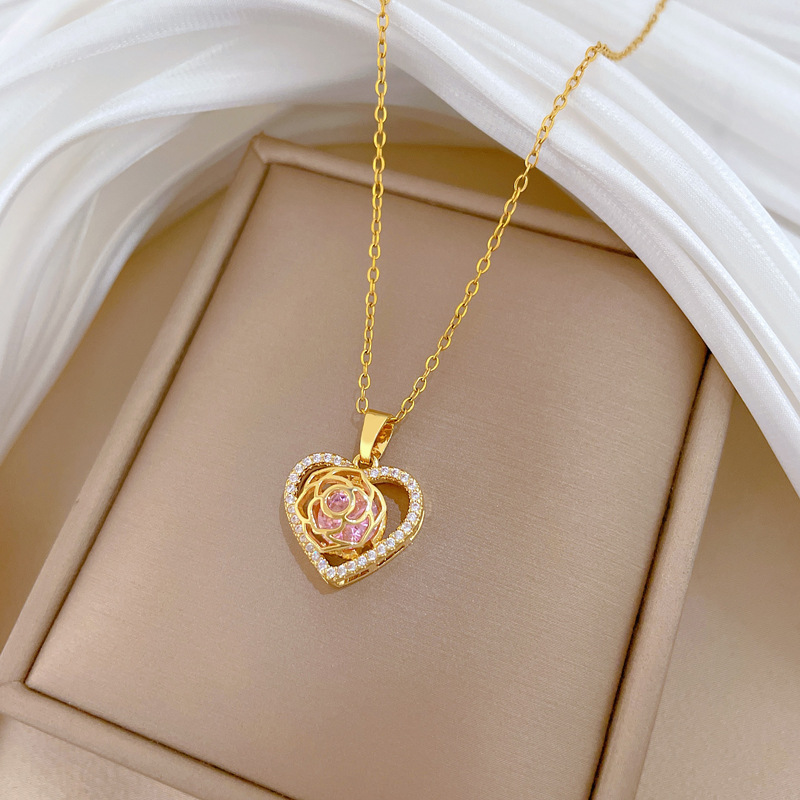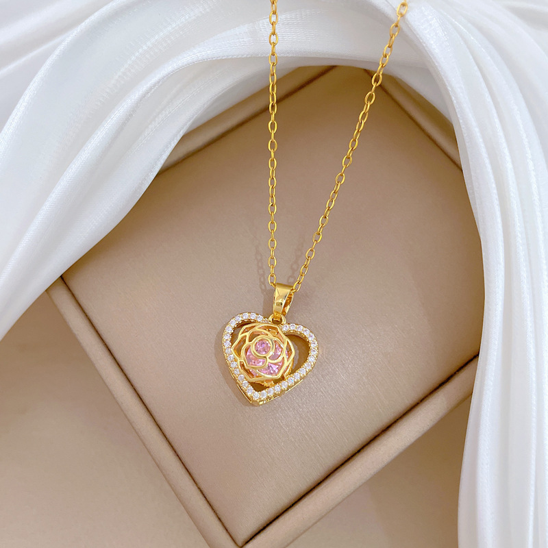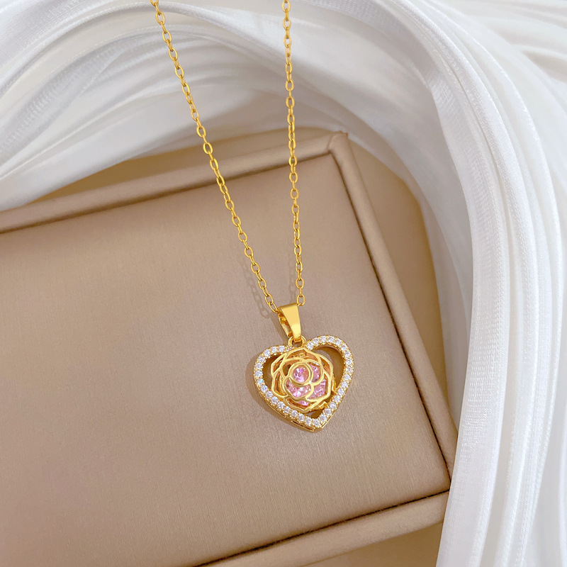 Titanium Steel Jewelry Necklace, with Brass, Heart, micro pave cubic zirconia & for woman & hollow, golden, Sold By PC