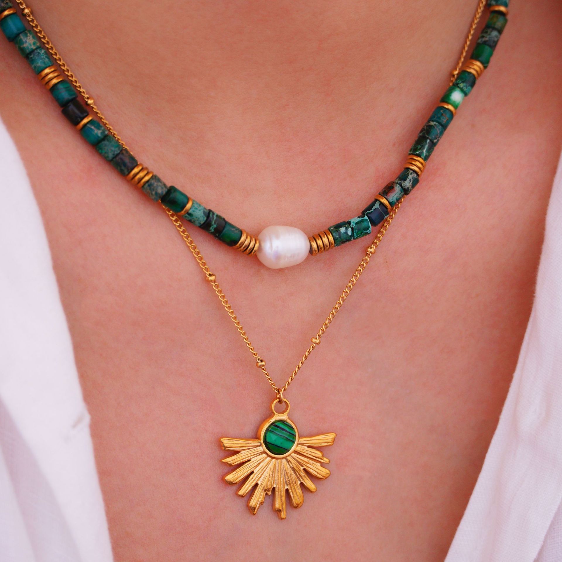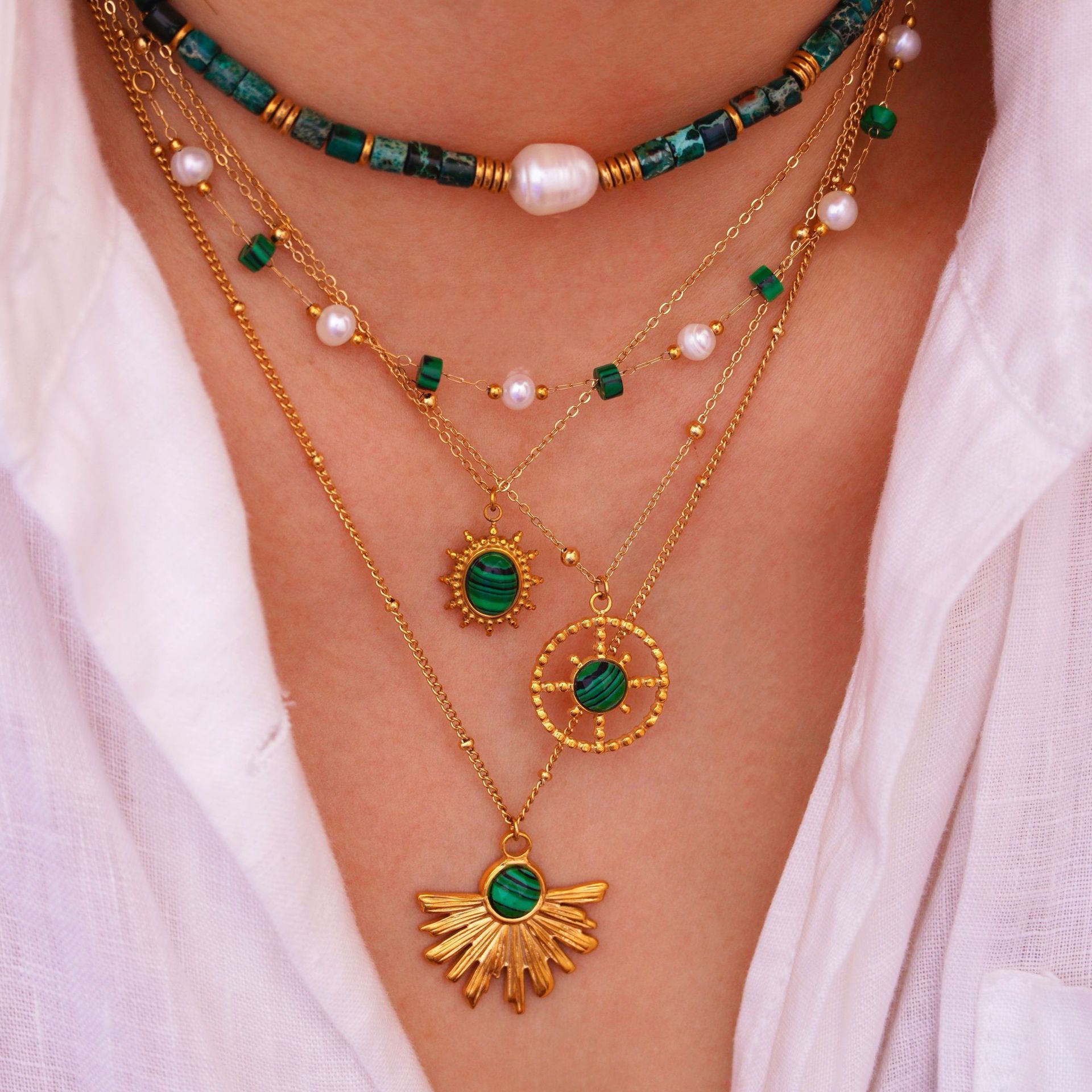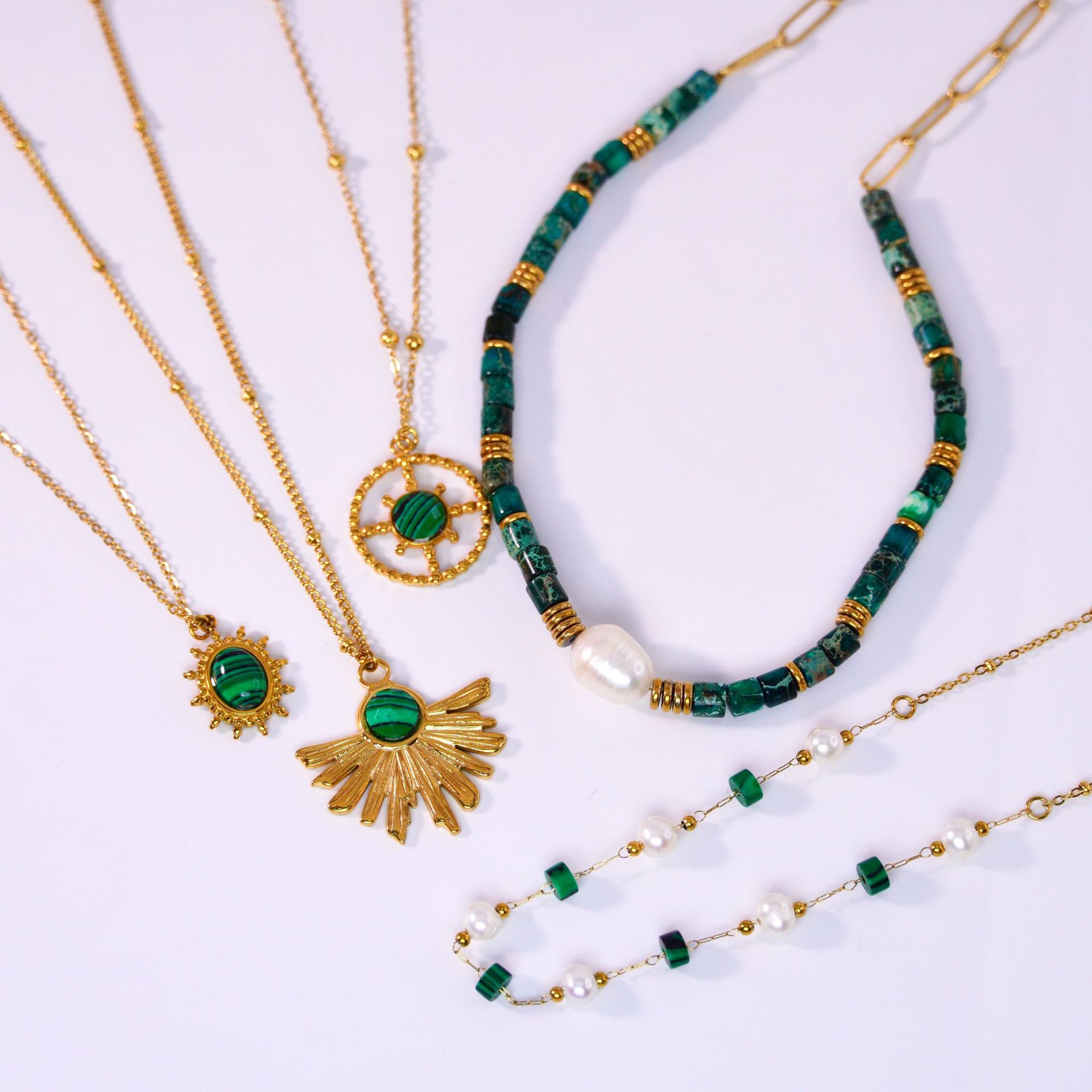 Titanium Steel Jewelry Set, with Malachite & Plastic Pearl, gold color plated, different styles for choice & for woman, Sold By PC