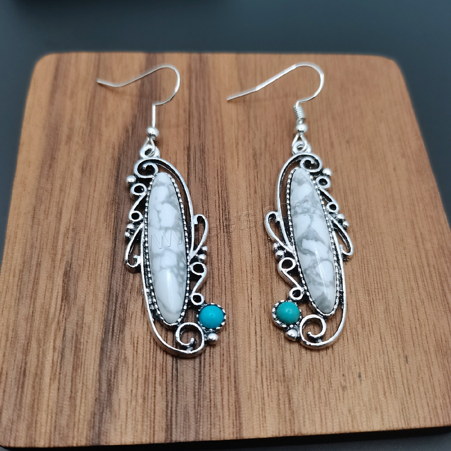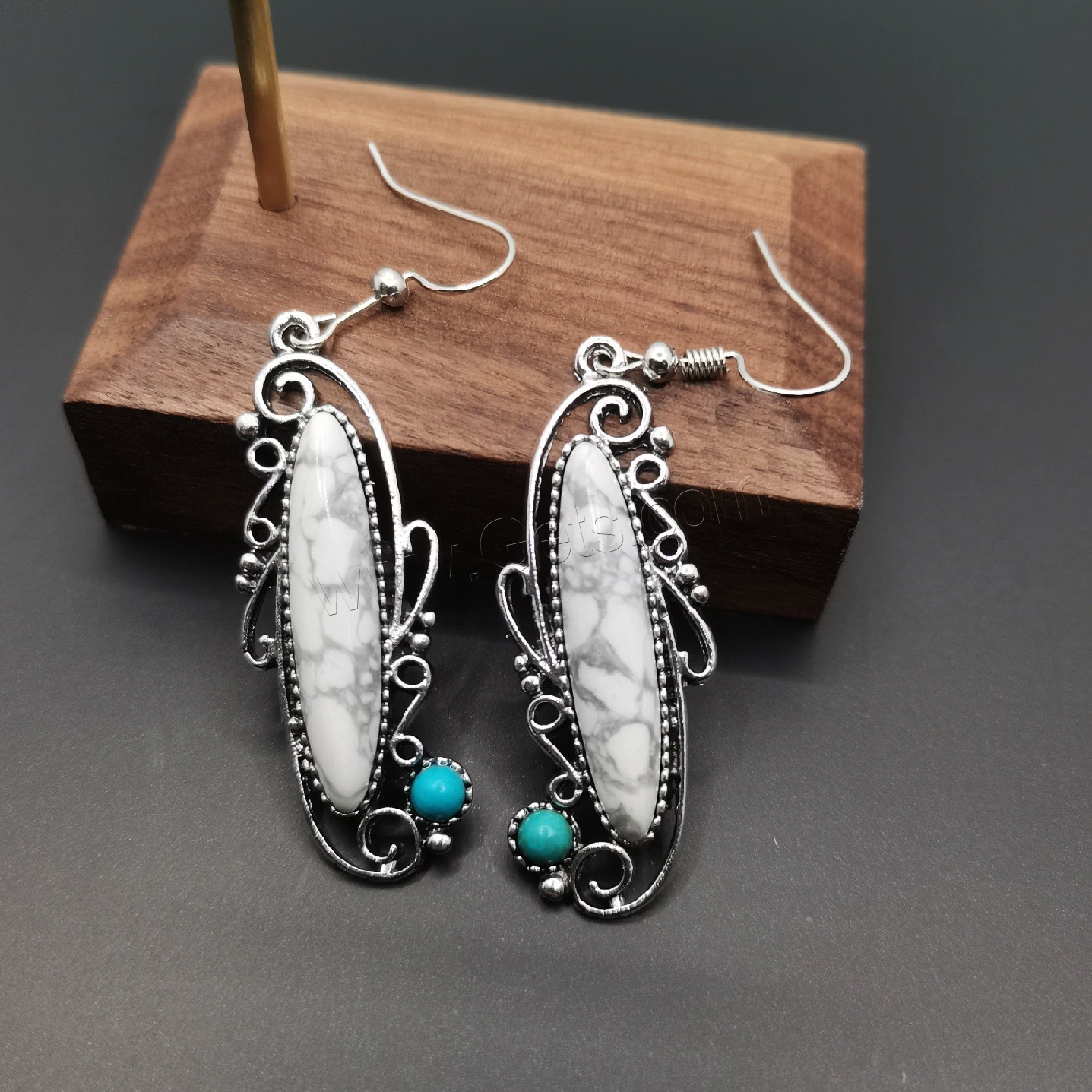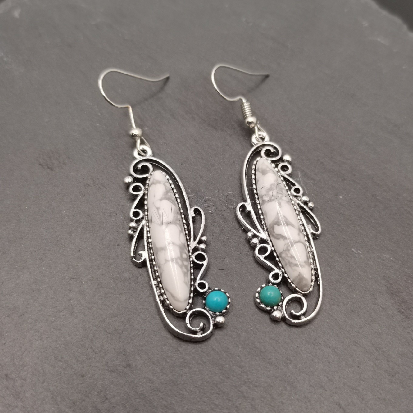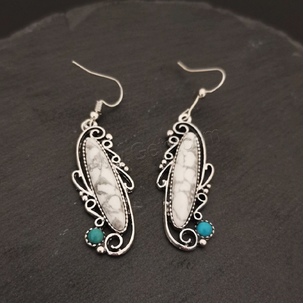 Turquoise Zinc Alloy Earring, with turquoise, brass earring hook, silver color plated, enamel & blacken 45mm