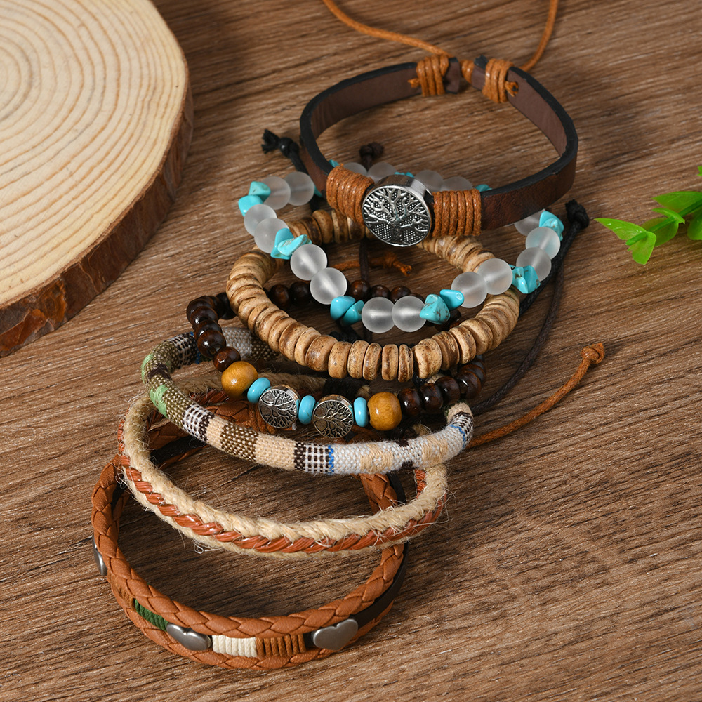 Wrap Bracelets, Zinc Alloy, with turquoise & PU Leather & Wood, handmade, 7 pieces & fashion jewelry & Unisex, Inner diameter :5.5-6.5cm., Sold By Set