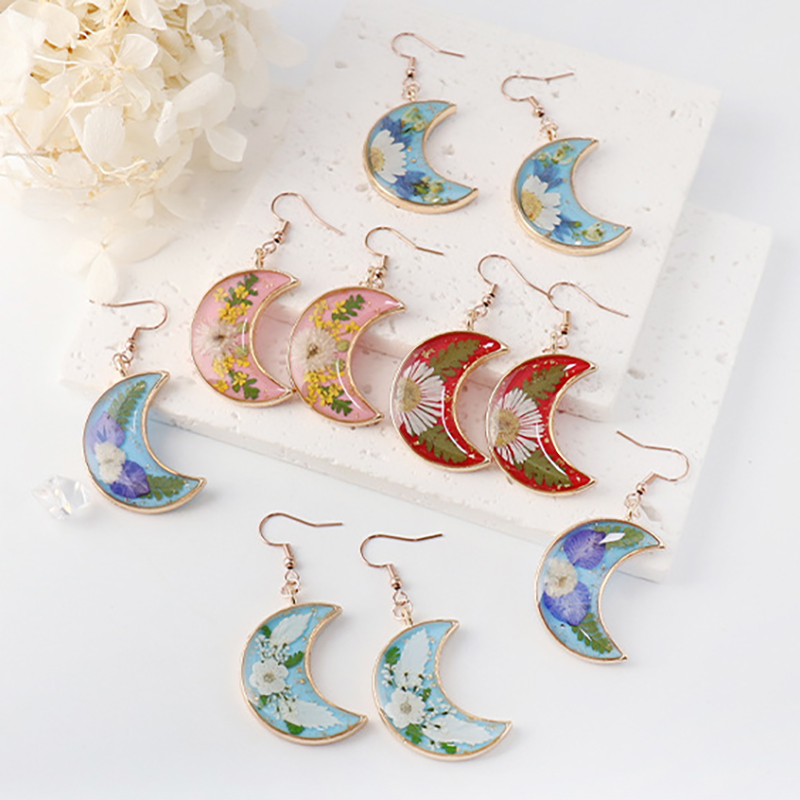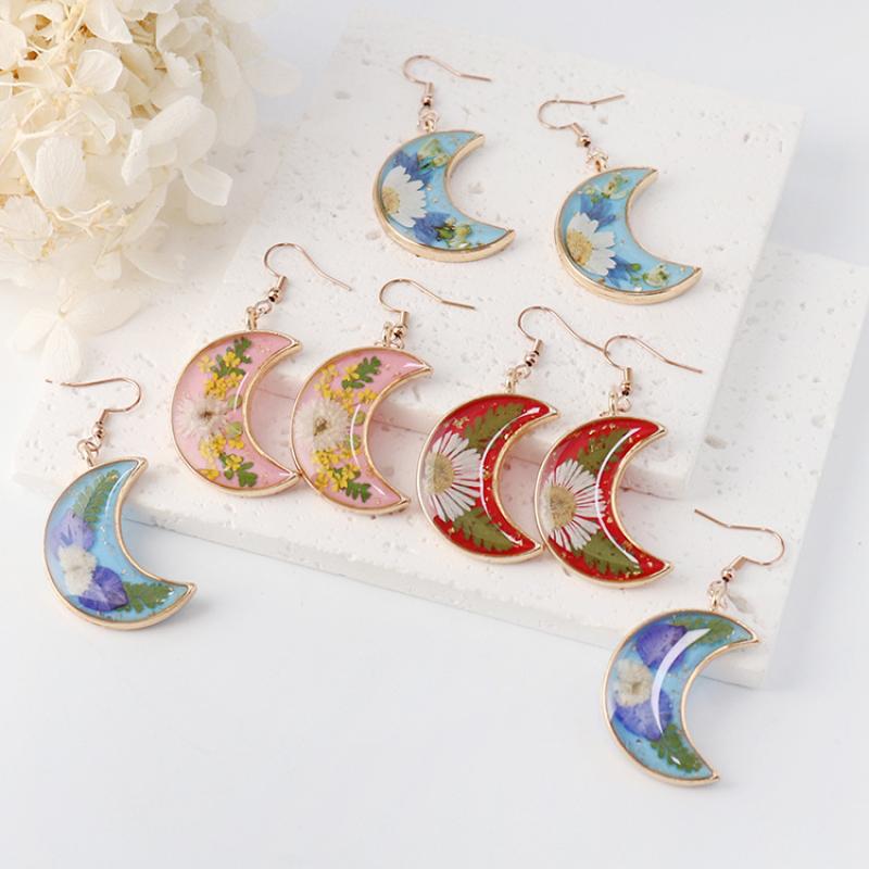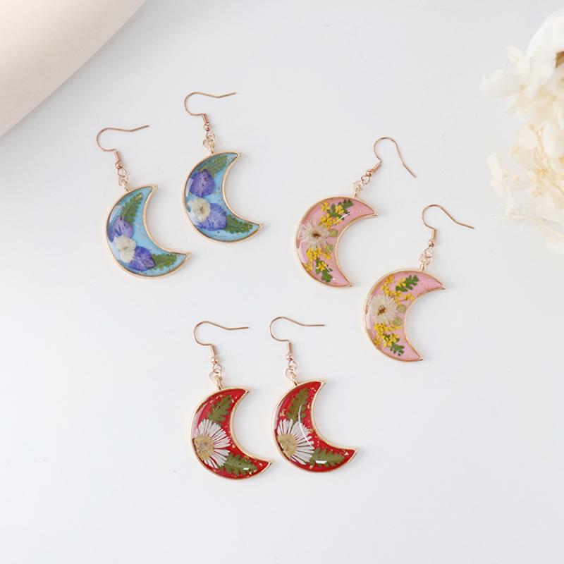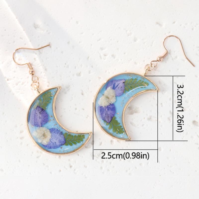 Zinc Alloy Drop Earring, with Dried Flower & Resin & 304 Stainless Steel, Moon, handmade, different designs for choice & for woman & epoxy gel, golden, 6Pairs/Bag, Sold By Bag