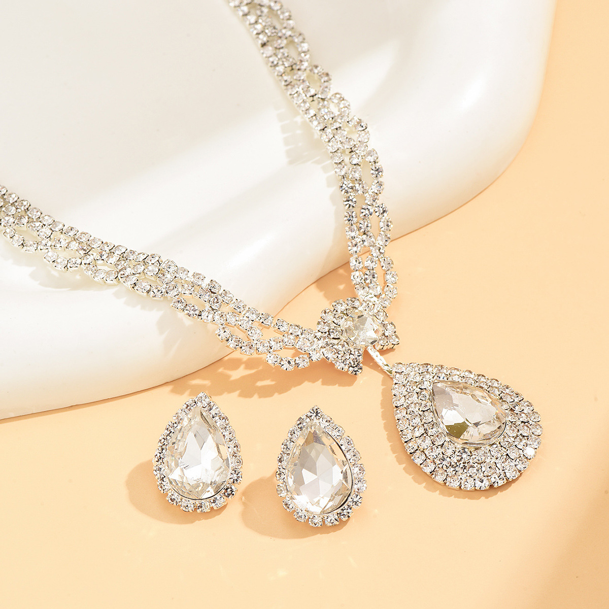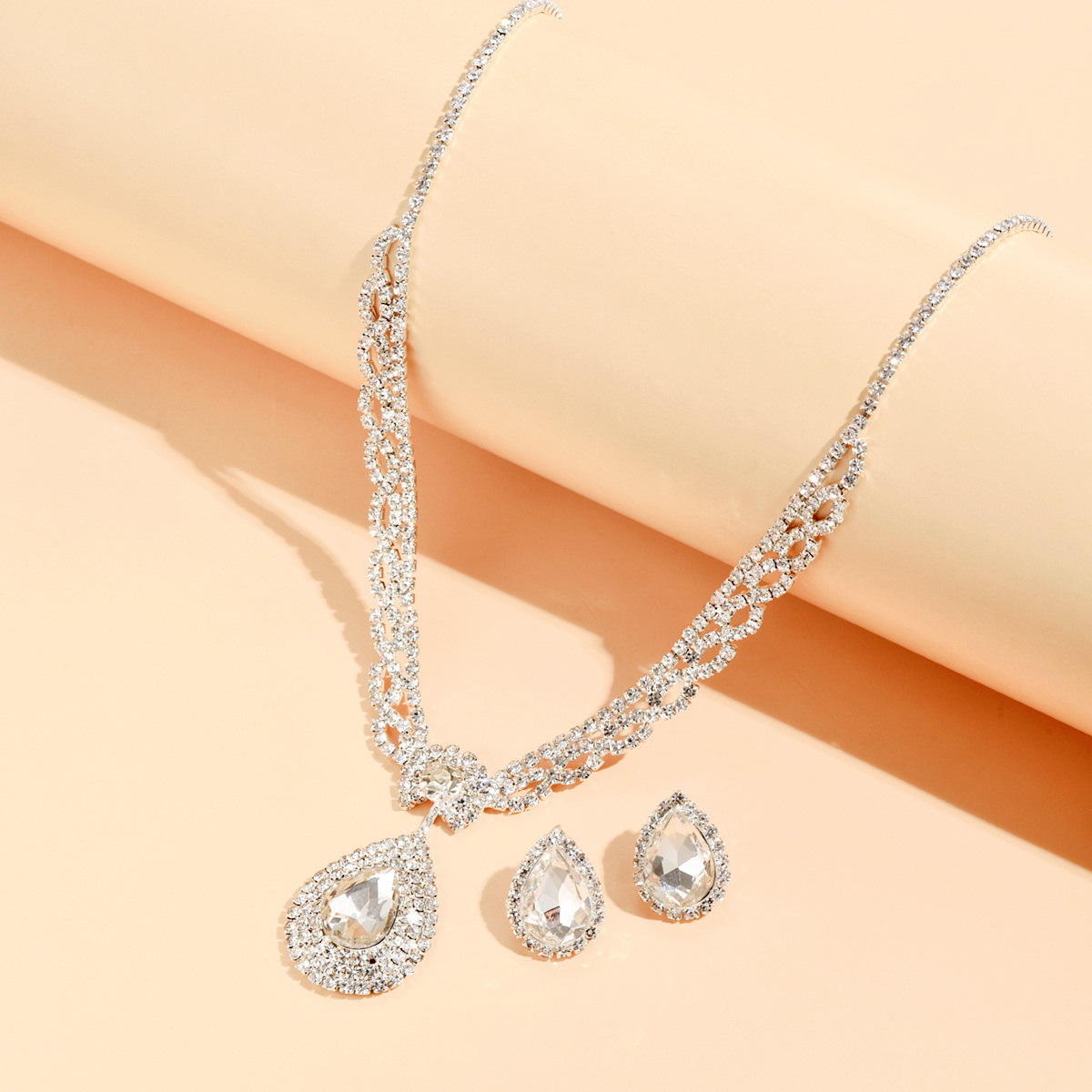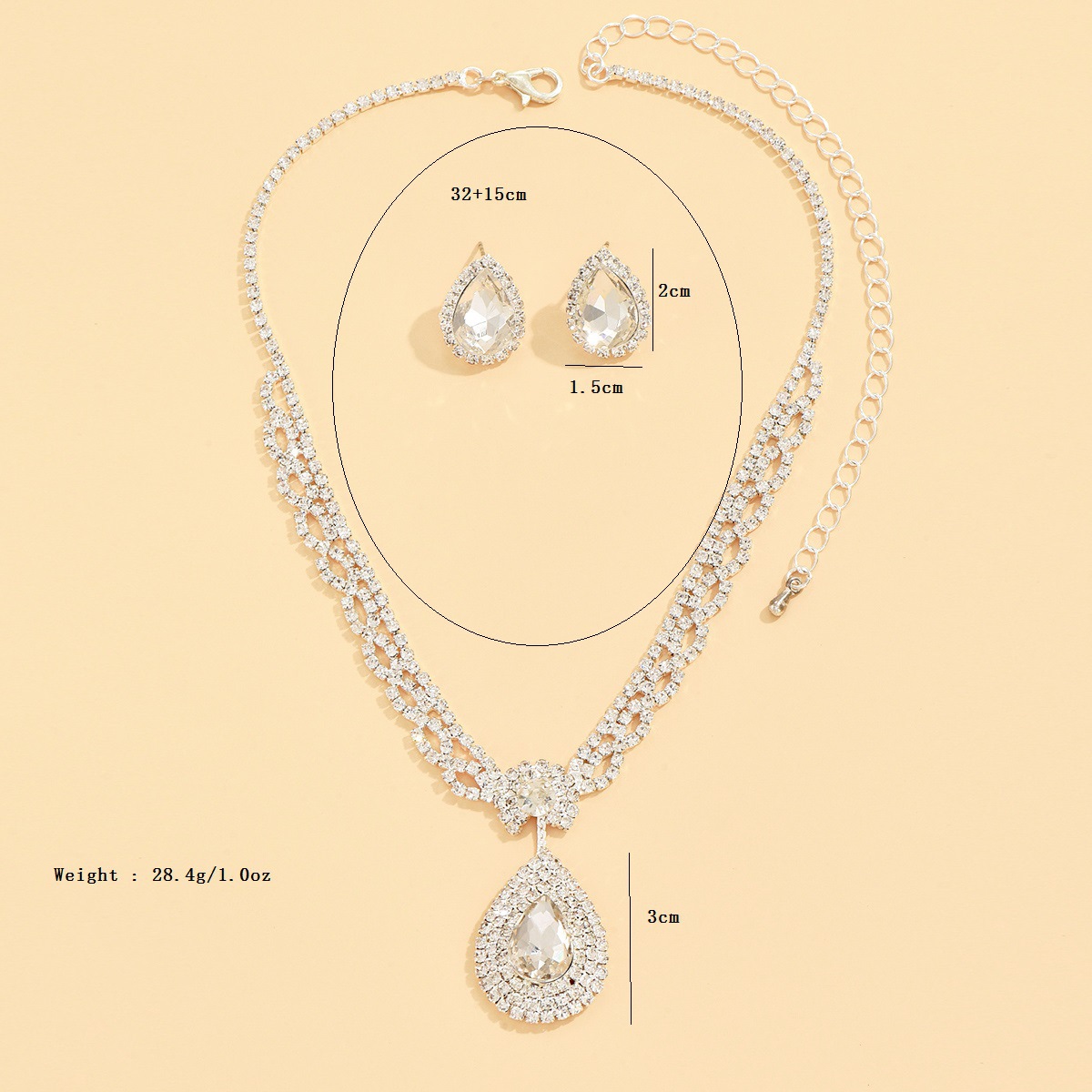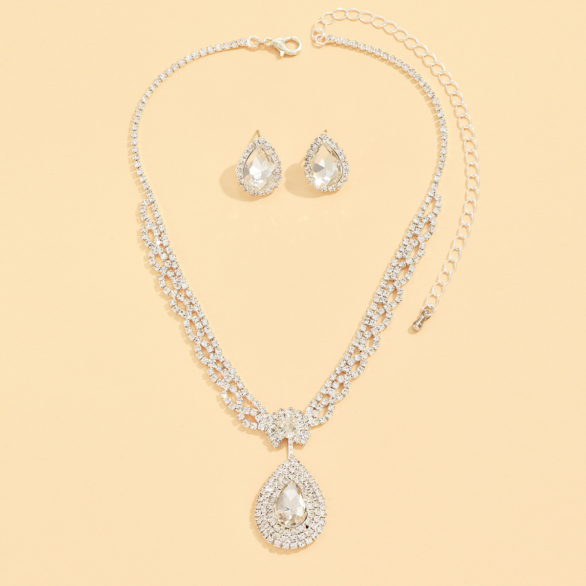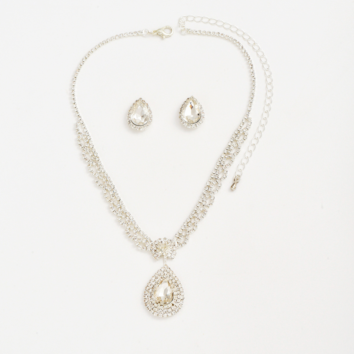 Zinc Alloy Jewelry Set, Stud Earring & necklace, Teardrop, silver color plated, 2 pieces & for woman & with rhinestone, Sold By Set
