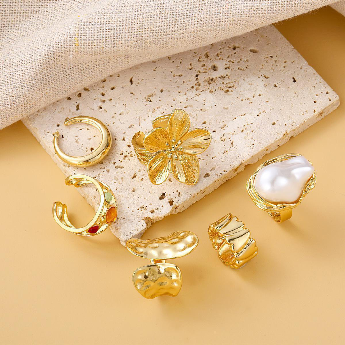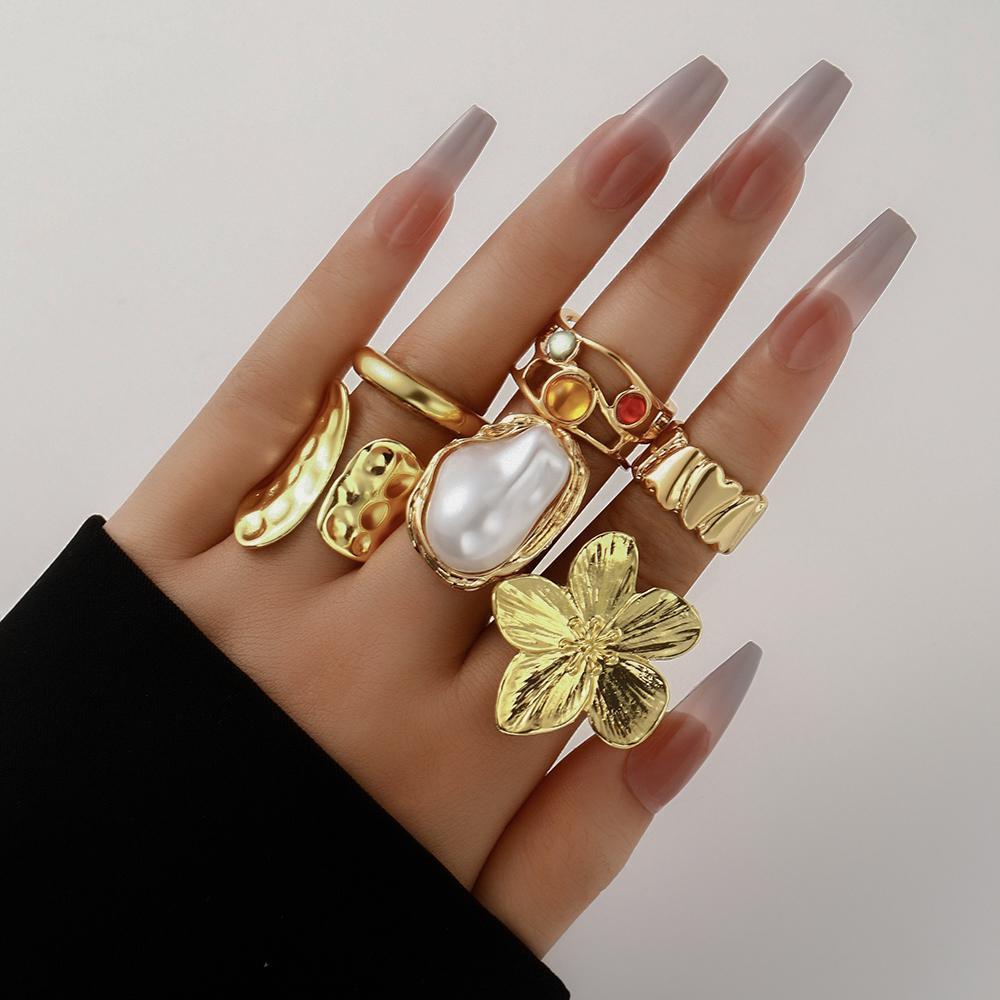Zinc Alloy Ring Set, with Crystal & Plastic Pearl, plated, 6 pieces & fashion jewelry & for woman, golden, Sold By Set
