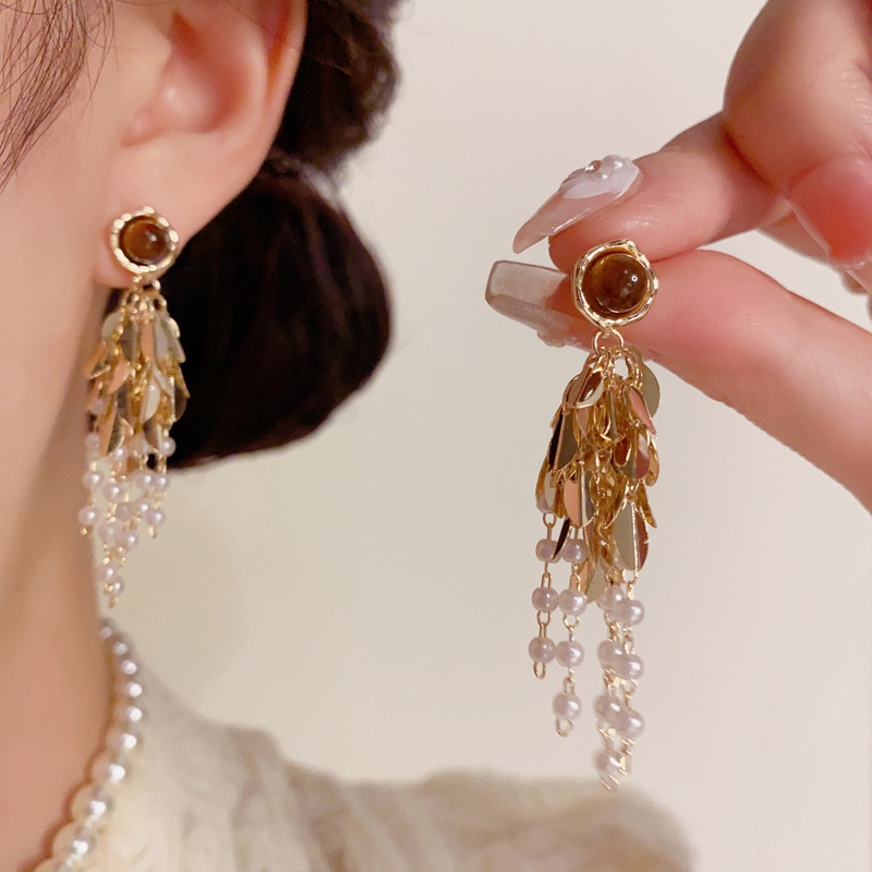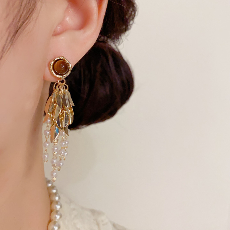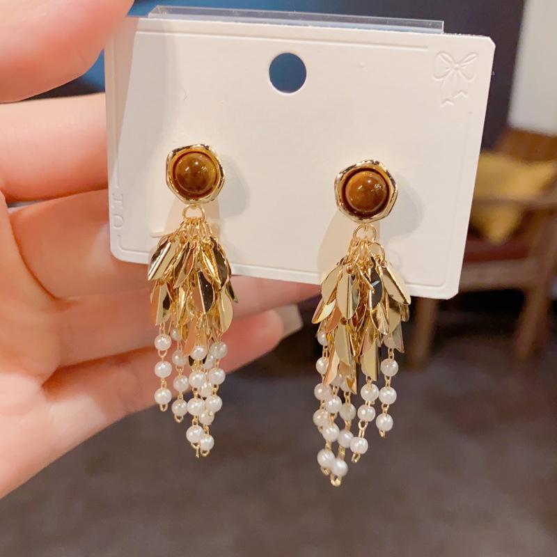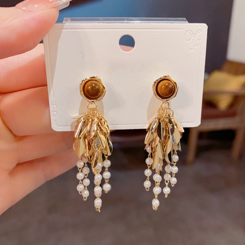 Латунные серьги падение, Латунь, с тигровый глаз & Пластиковая жемчужина, плакированный настоящим золотом, ювелирные изделия моды & Женский, 58x15mm, продается Пара