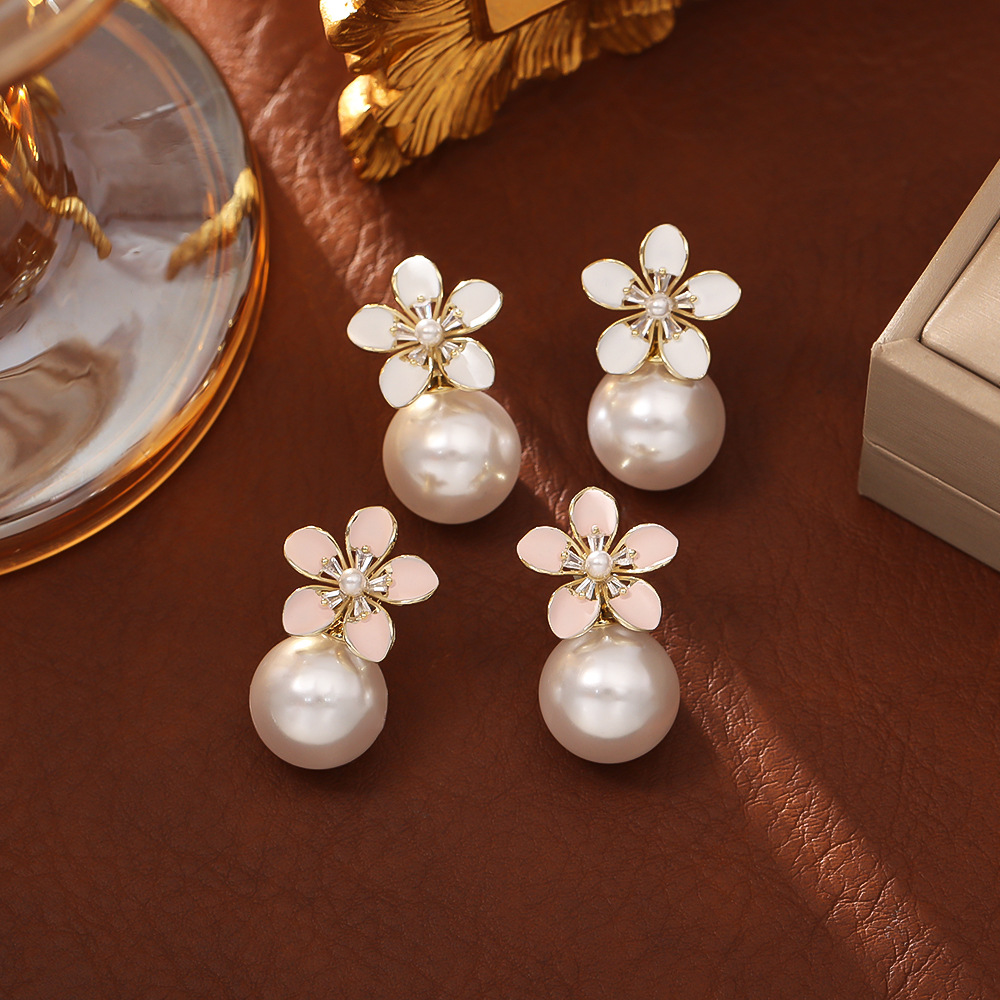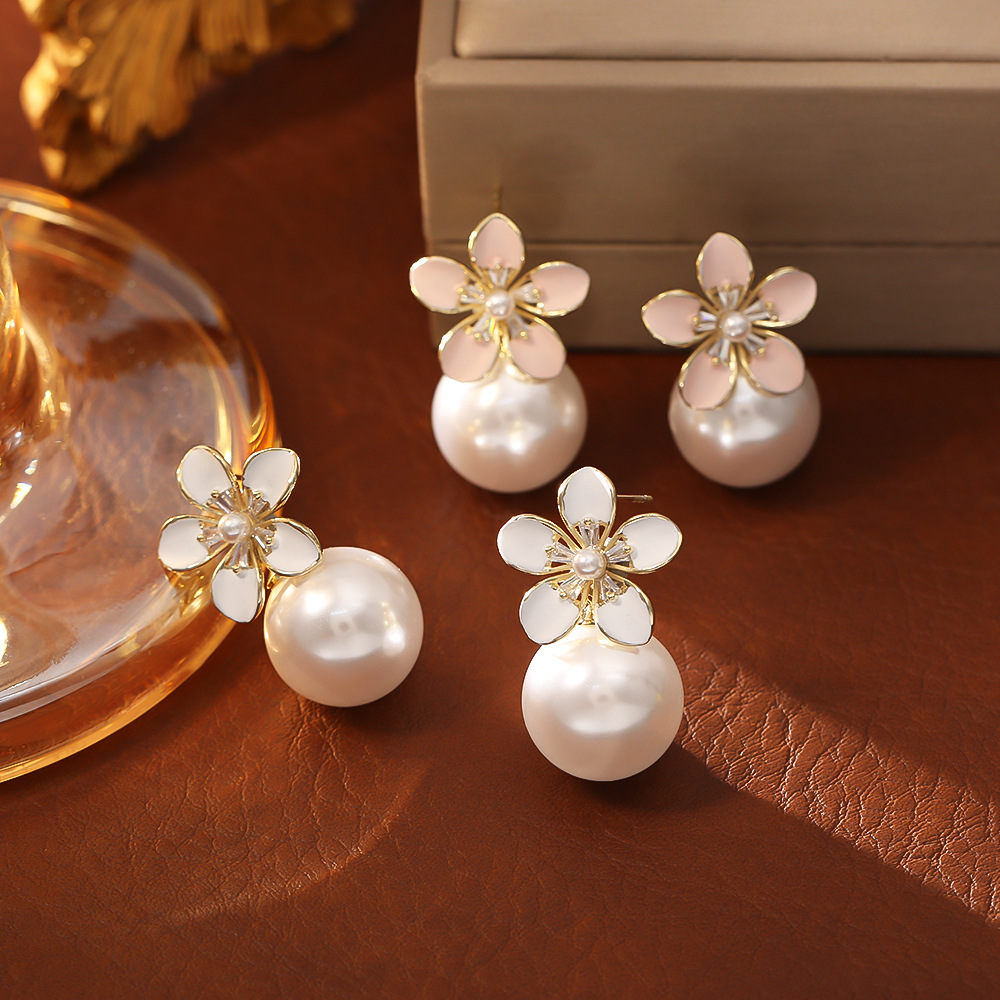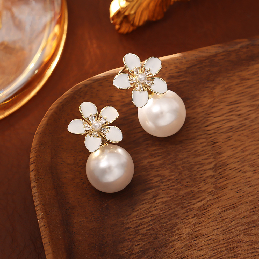 White flower pearl stud earrings